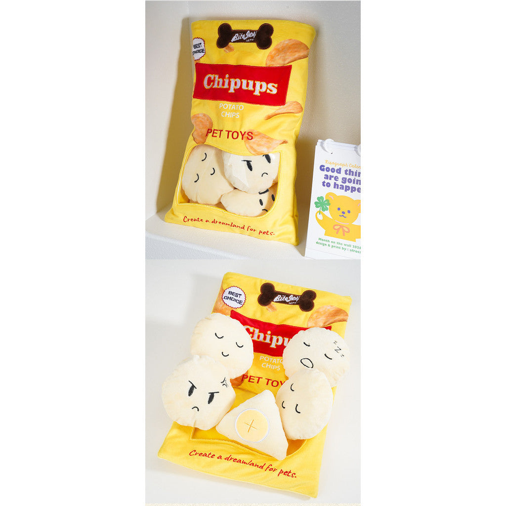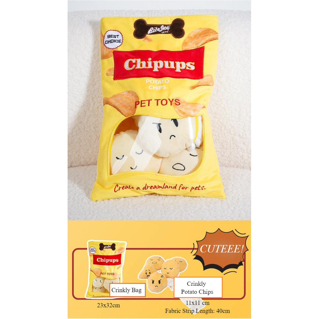 While you snack on a pack of potato chips, your fur kids can indulge too with their own delightful plush chip bag toy, fostering shared enjoyment and fun moments. Our adorable pet soft toy designed to resemble a crinkly potato chips bag. Each potato chip has pockets to hide treats for added fun.