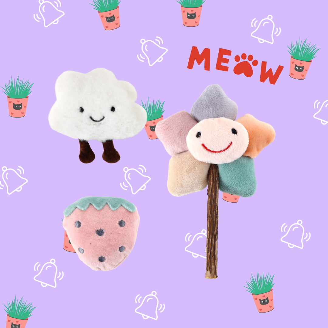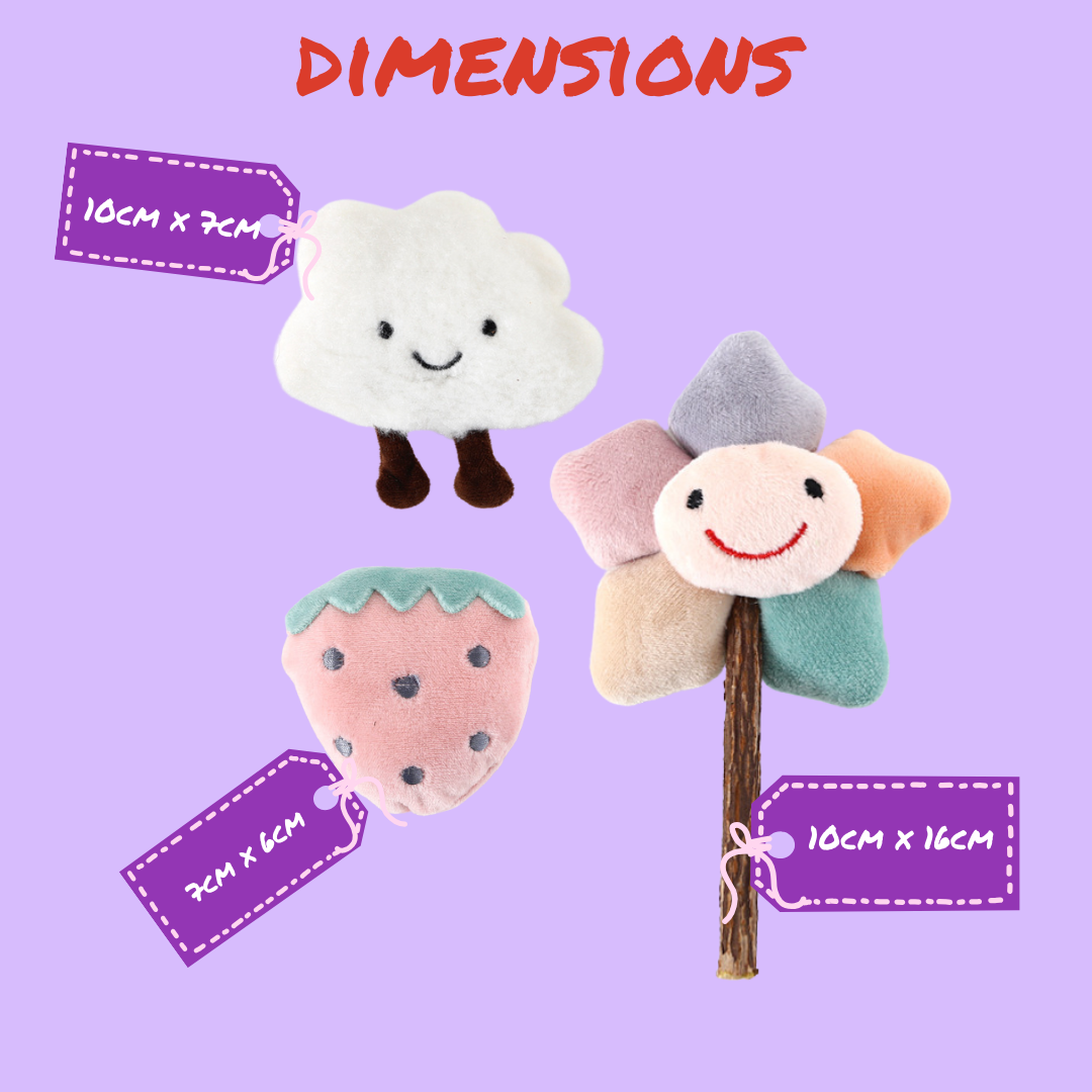 Cloud Nine: 3 toys - 10cm x 7cm (Cloud), 7cm x 6cm (Strawberry), 10cm x 16cm (Flower wand)