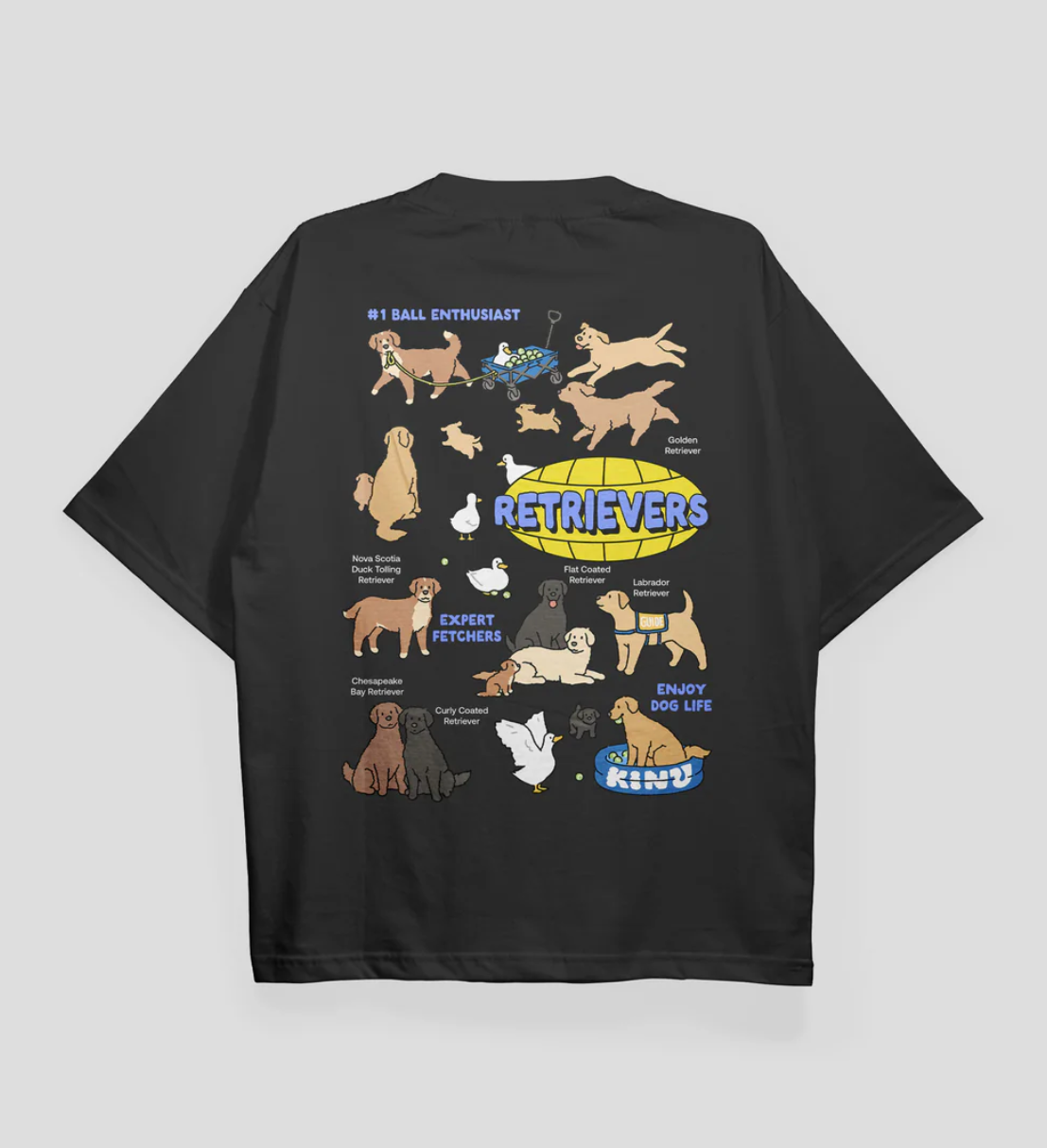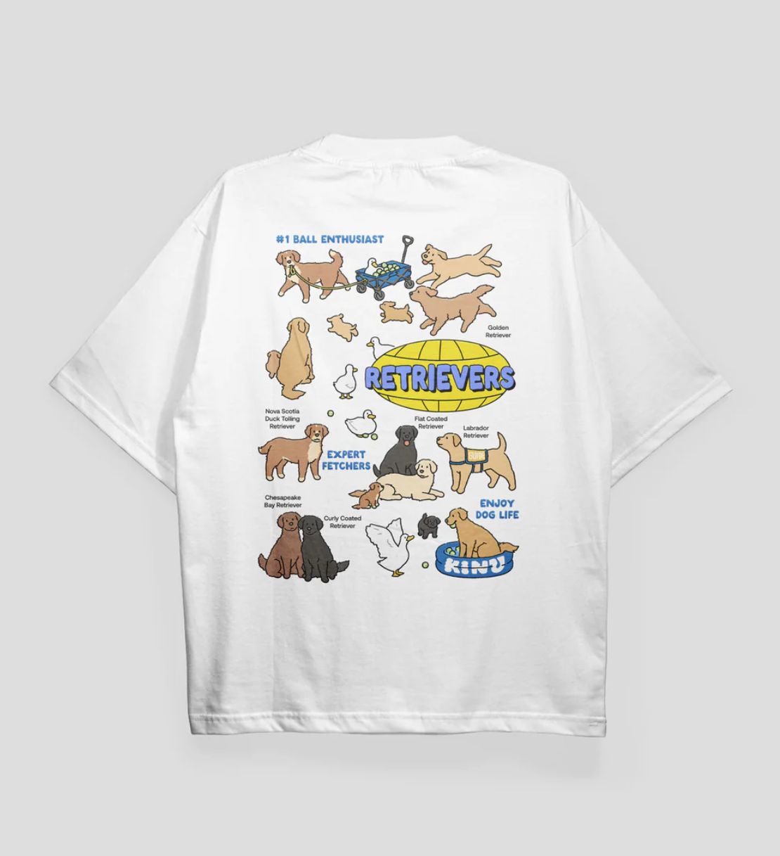 Show your love for retrievers with our Retriever Club tee. This design features six iconic retriever breeds illustrated in our signature house style, complete with playful details like ducks, tennis balls, water splashes, and paw prints. Perfect for casual days and for anyone who adores this loyal and lovable breed group.