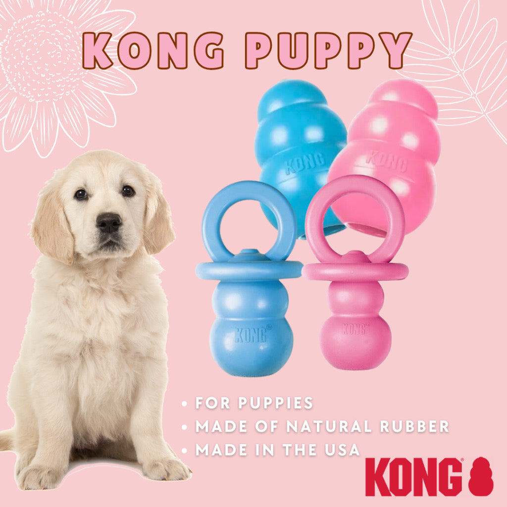 - Unique pacifier shape and soft KONG Puppy Rubber designed to soothe sore teeth and gums