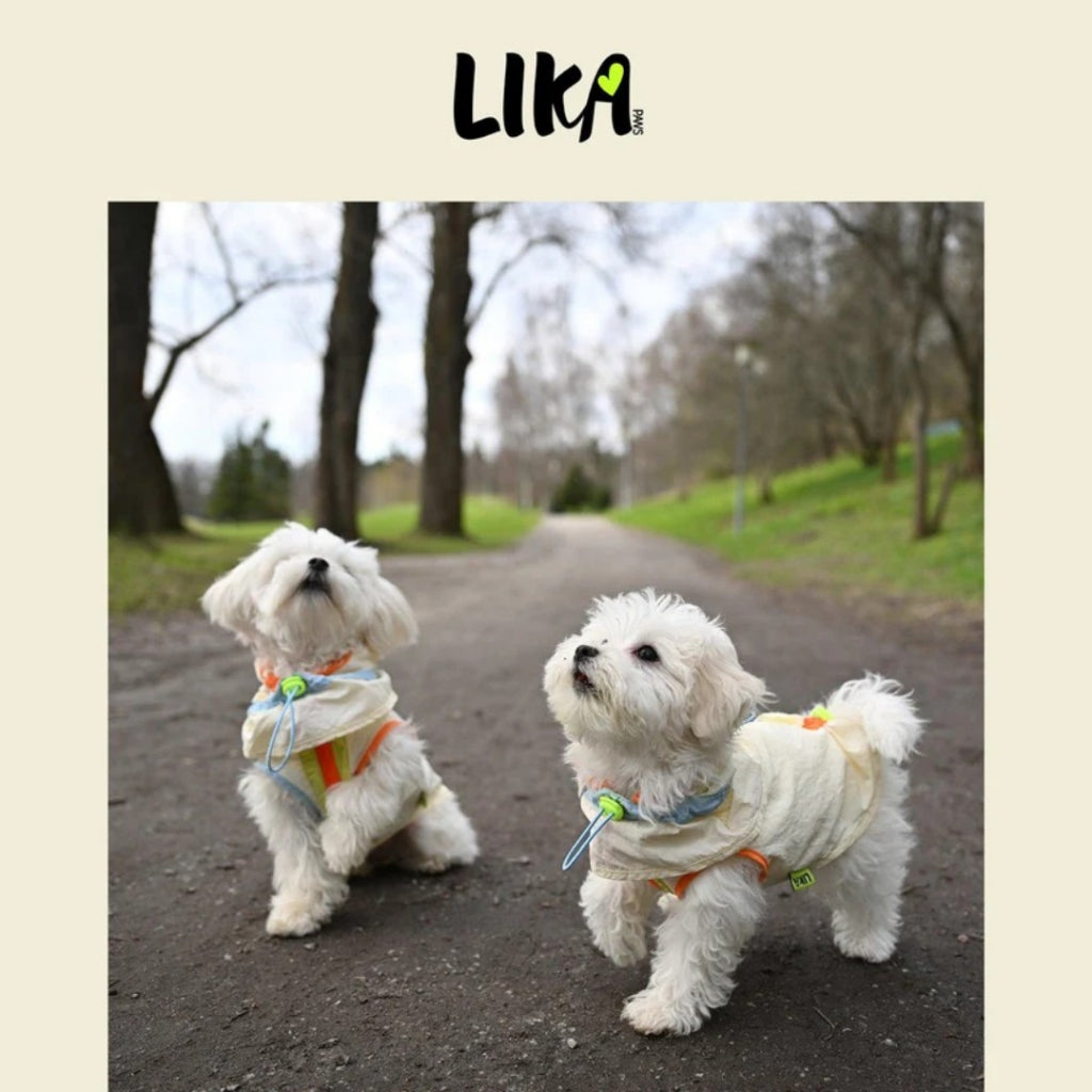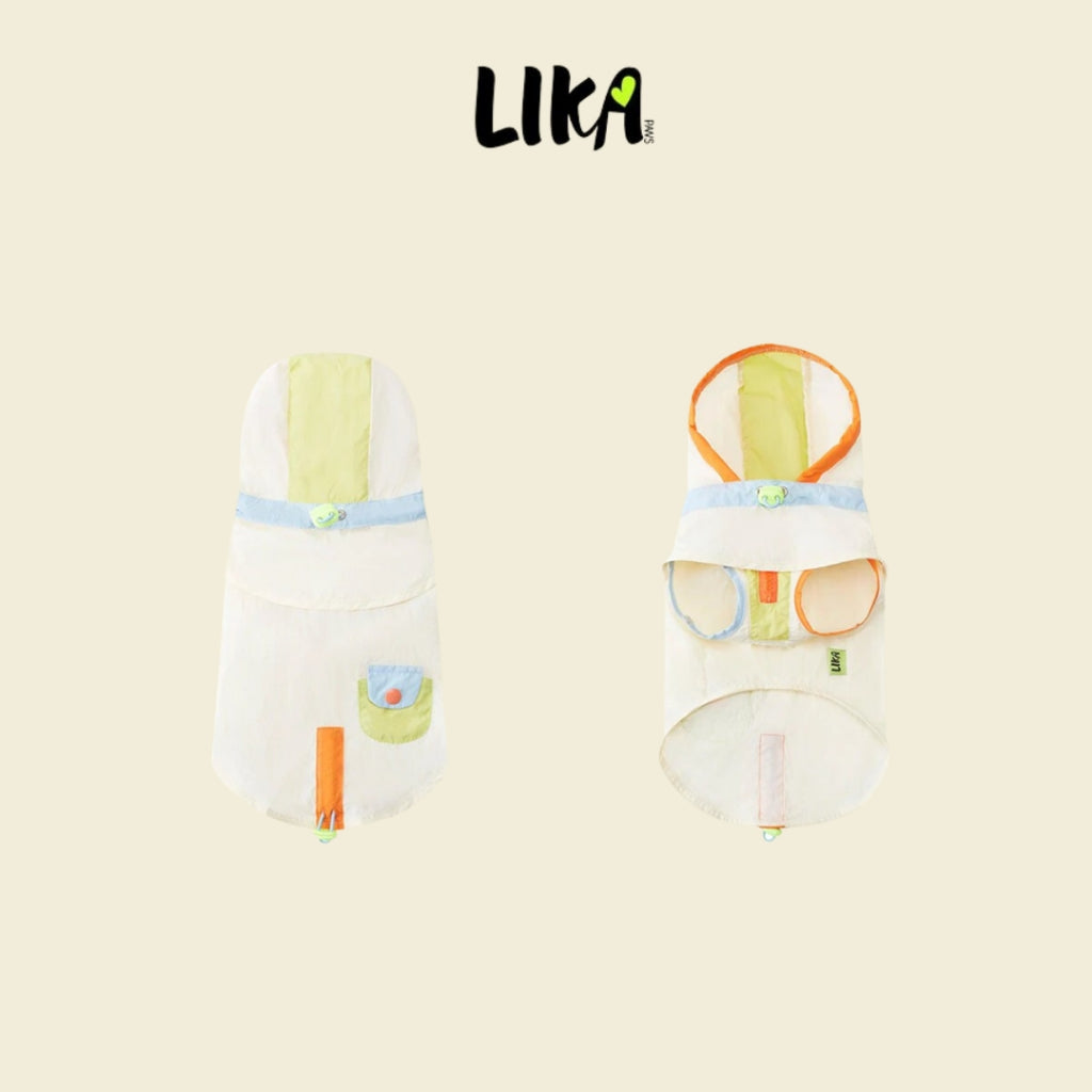 Splash-proof and UV50 sun protection, lightweight and comfy! Perfect for rainy or sunny summer days. The color-blocked design with a cute little pocket adds a fun touch. The hood can be easily removed, and multiple drawstrings let you adjust the hood size and jacket length. Your pet will be ready for any adventure!