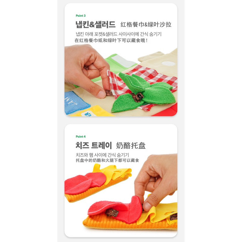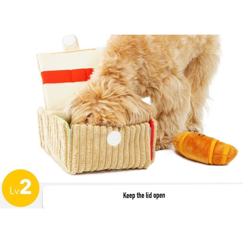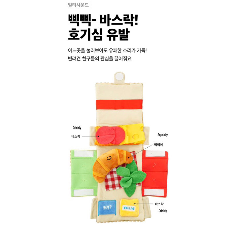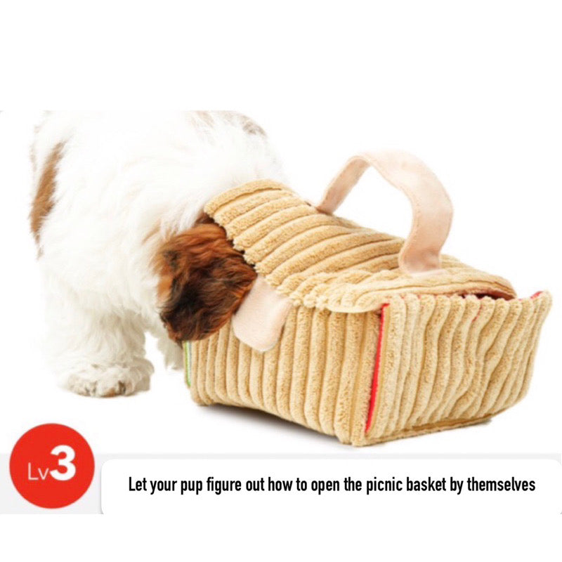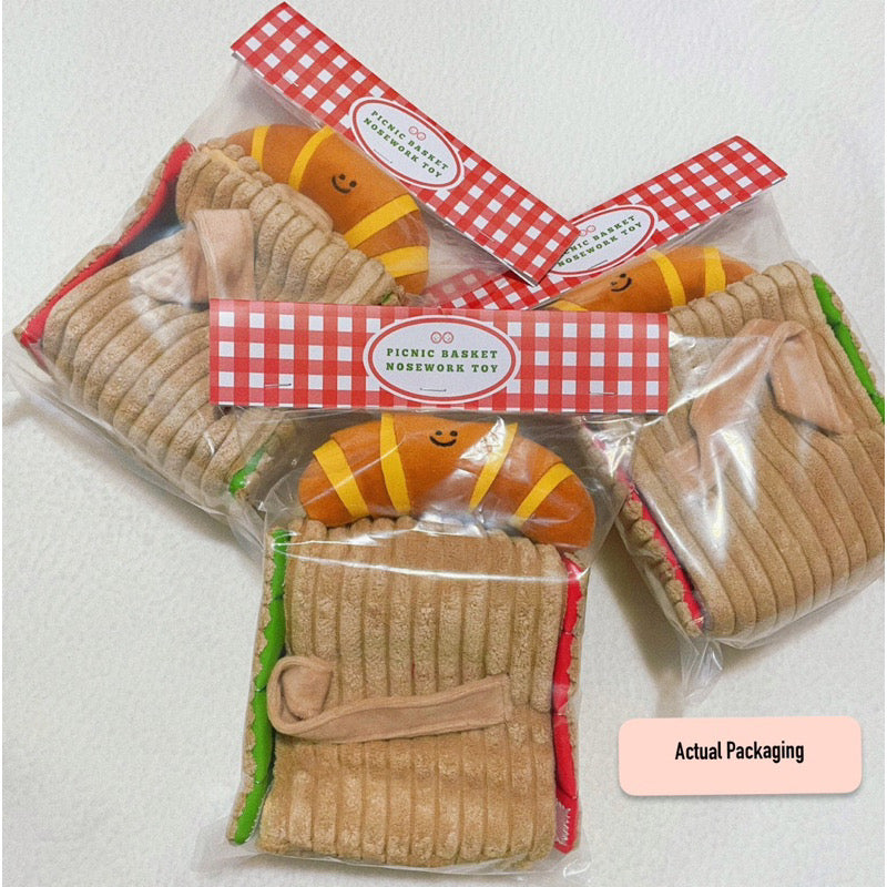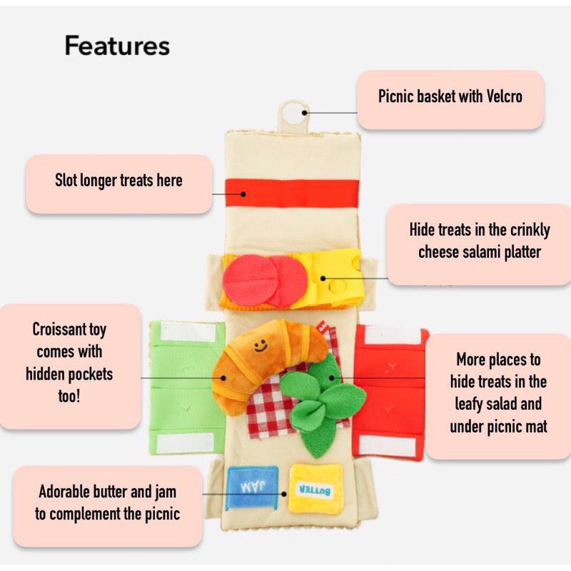 This picnic basket is perfect for sniffing games. The croissant and picnic basket comes with plenty of hidden pockets to hide treats in. The material of the salami cheese platter is crinkly and the croissant is mildly squeaky. Perfect for dogs which do not fancy overly loud squeaky toys. Your furkid will LOVE this toy!