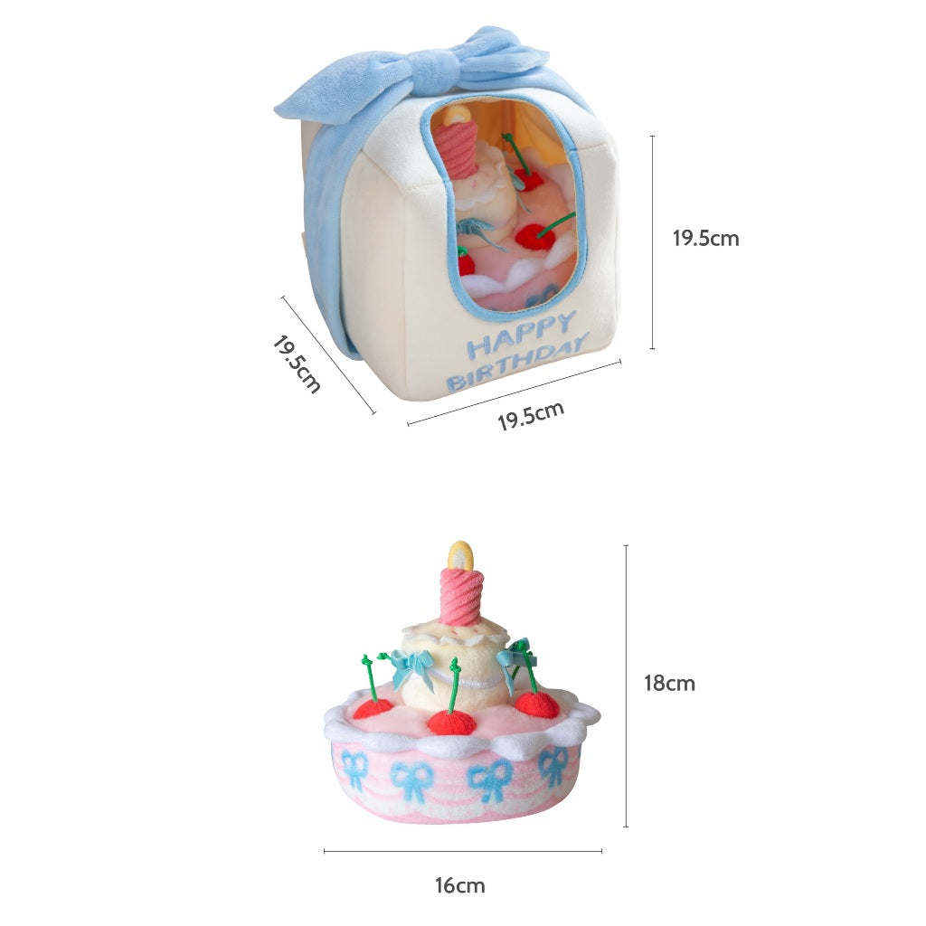The plush birthday cake features snuffle pockets hidden under the cherries and candle, perfect for tucking in treats to encourage natural foraging behavior. The crinkly gift box and cake add an extra layer of sensory fun, while the removable squeaky candle keeps playtime exciting!