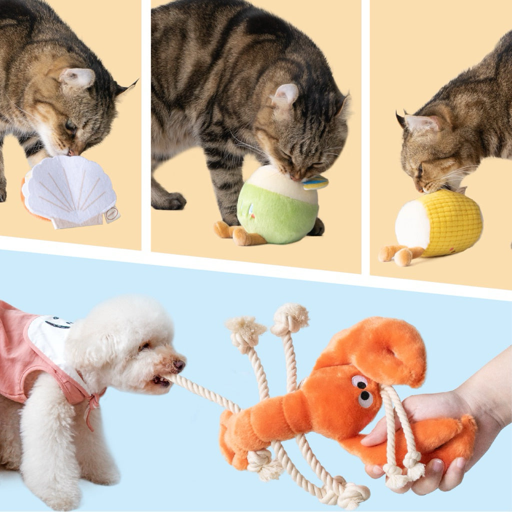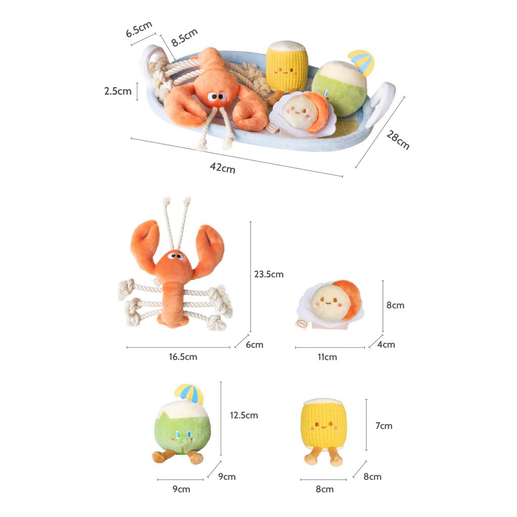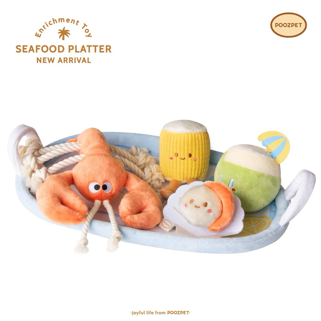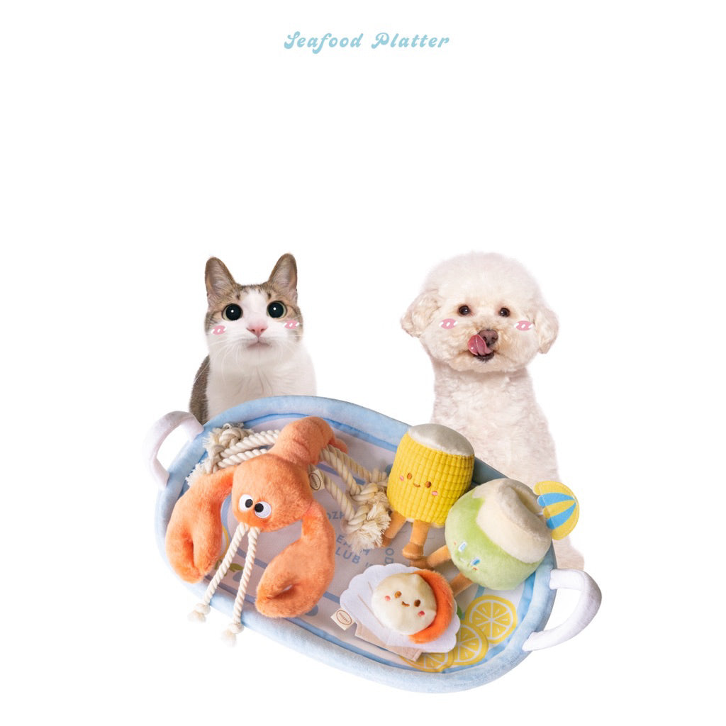 Introduce your furry friend to a world of sensory exploration with our Seafood Platter snuffle toy! Suitable for dogs, cats and even bunnies! Designed to stimulate your pet's natural foraging instincts, this charming toy features a whimsical seafood platter tray, complete with 4 individual toys.