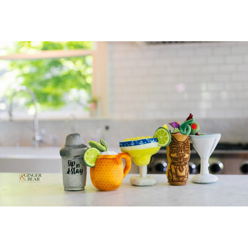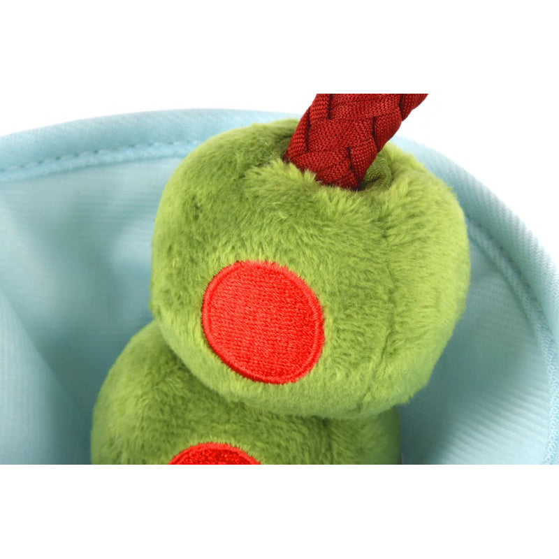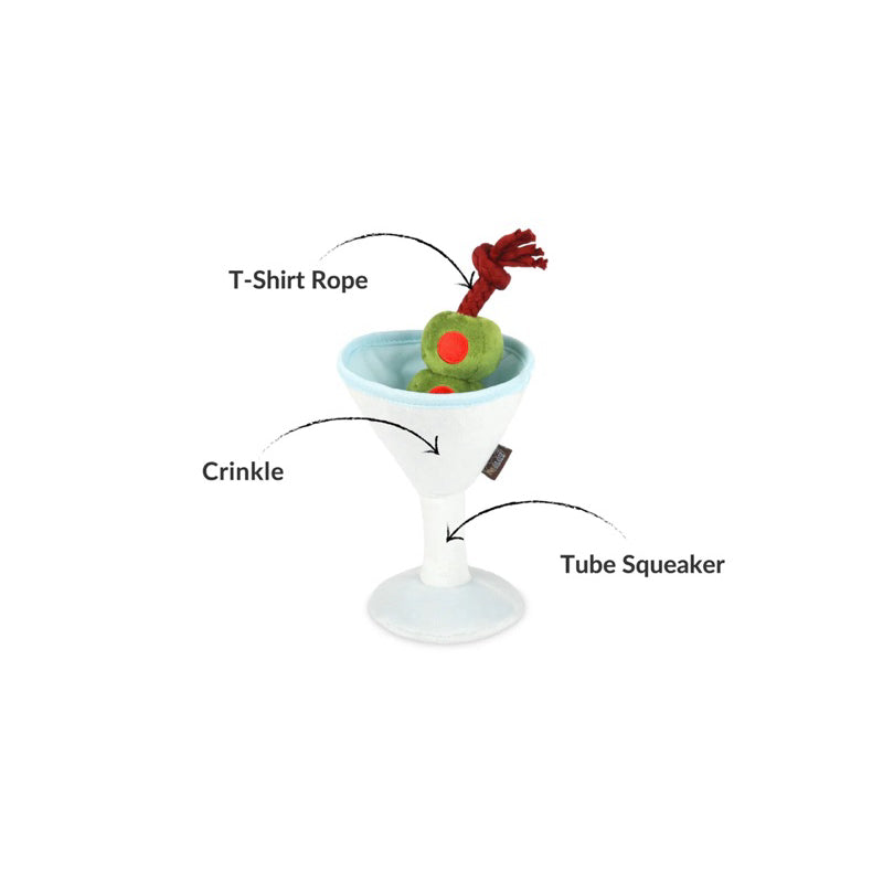 If you'd rather have it shaken and not stirred. In a much more elevated fashion. A crinkly Pawtini glass with tube squeaker in the stem which means a satisfying squeak is easily accessible. If you decide to play tug with your furry buds, check out the t-shirt rope that holds olives. Cheers!