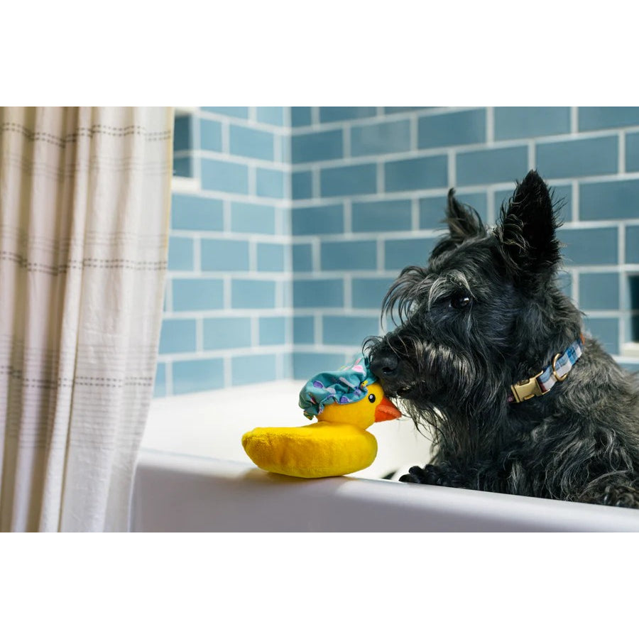 Meet Bubbles the Duck... yellow, cheerful and wears a crinkly shower cap. Bubbles comes with a disc squeaker, so getting that squeak is much easier. Yes, Bubbles squeaks!