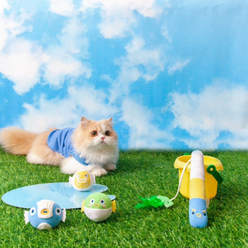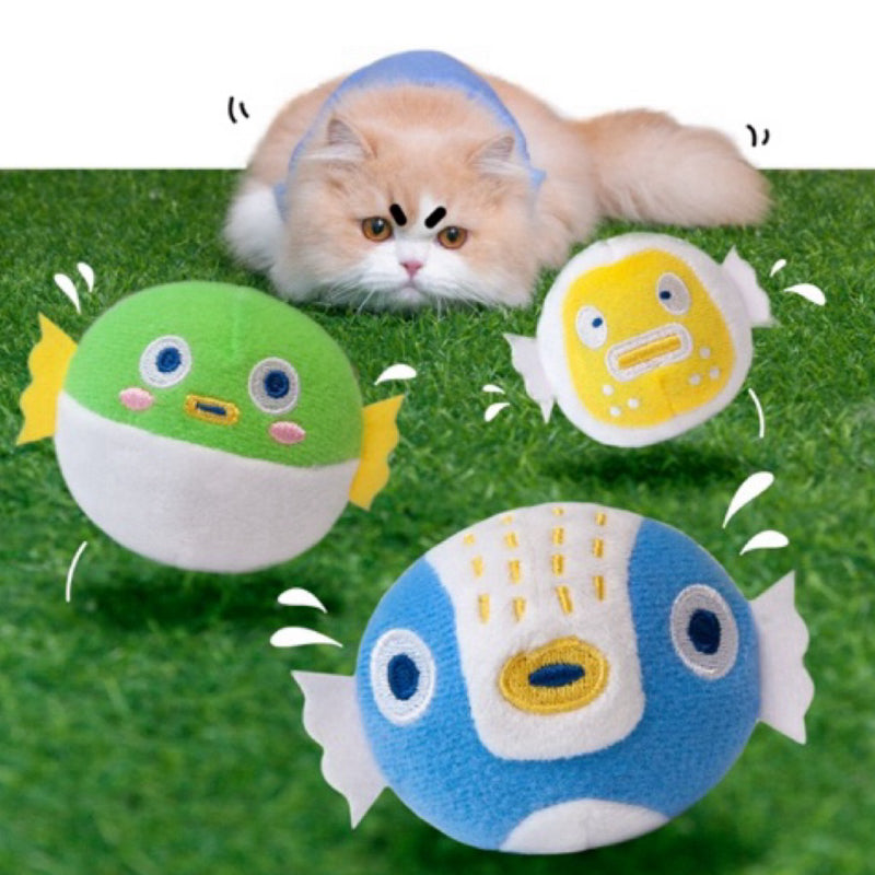 Each set comes with 3 pufferfish toys (with catnip), 1 wand and 1 feathery plant toy.