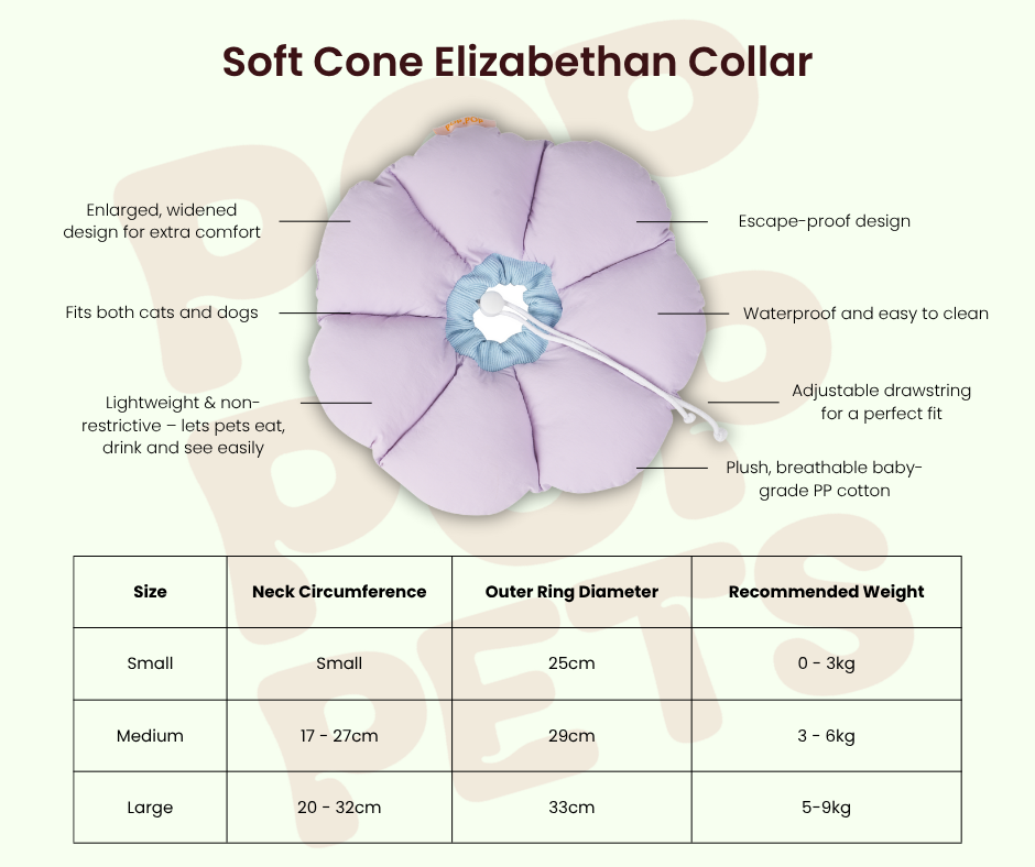 Help your pet recover in style and comfort! The Soft Cone Drawstring Elizabethan Collar features a charming flower shape and a lightweight, non-restrictive design that’s perfect for both cats and dogs. It prevents your pets from reaching/licking their wounds and are lightweight and comfortable to wear all day. They can also be washed easily and reused. This enlarged and widened collar offers extra protection while letting your furry friend eat, drink, and play without blocking their view. These cones do not have velcro.