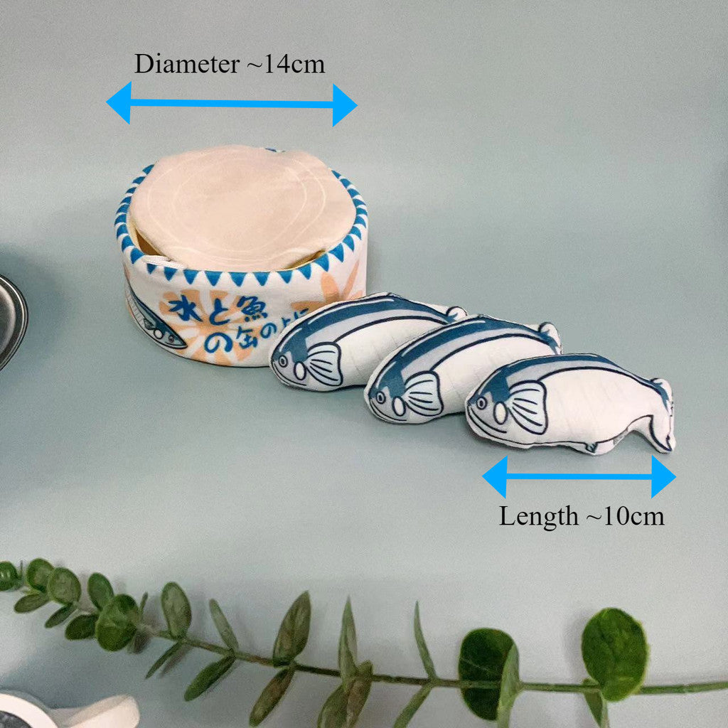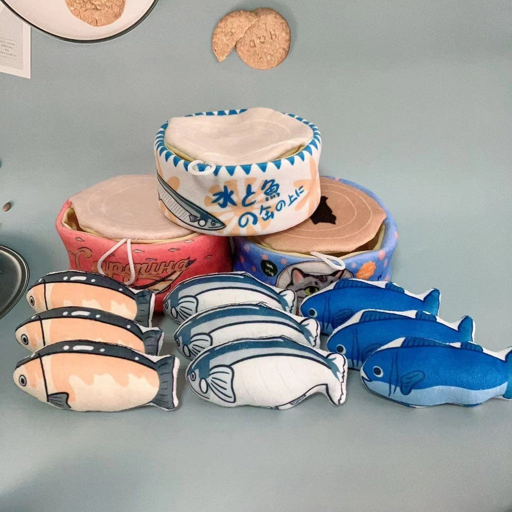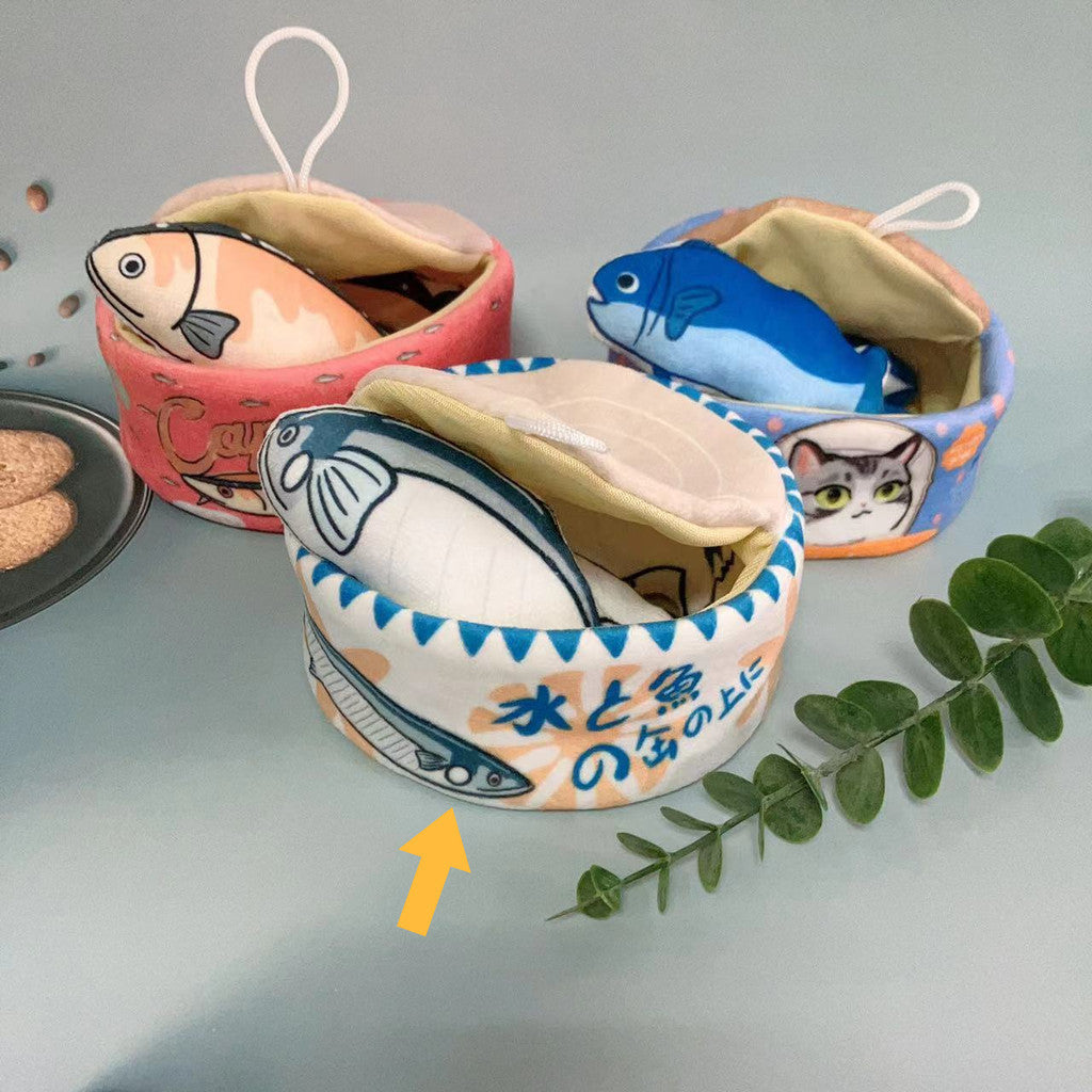 (Note: Our plush toy currently only features the canned tuna - blue and white fish)